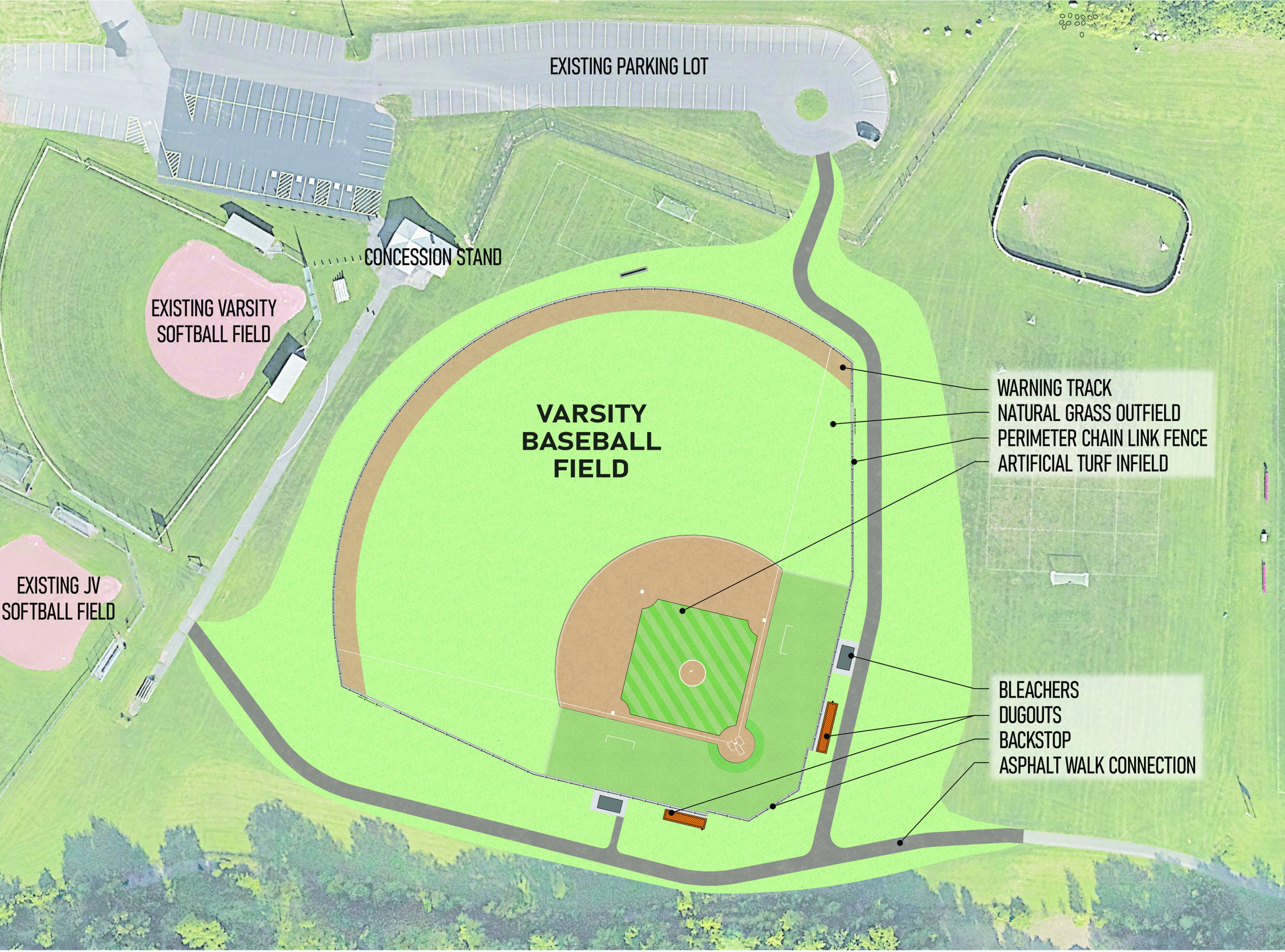 - New bleachers, dugouts, backstop, asphalt walking path, natural grass outfield, artificial turf infield, new perimeter fencing.